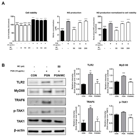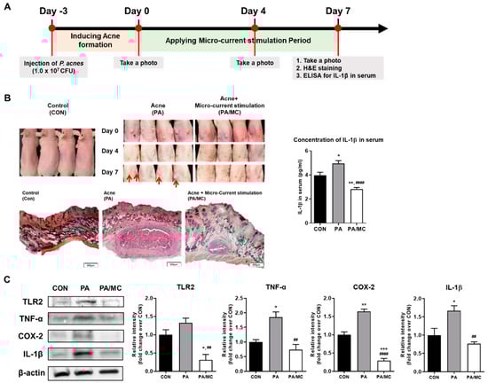 APA StyleLee, H., Hwang, D., Lee, M., Lee, J., Cho, S., Kim, T.-J., & Kim, H. S. (2022). Micro-Current Stimulation Suppresses Inflammatory Responses in Peptidoglycan-Treated Raw 264.7 Macrophages and Propionibacterium acnes-Induced Skin Inflammation via TLR2/NF-κB Signaling Pathway. International Journal of Molecular Sciences, 23(5), 2508. https://doi.org/10.3390/ijms23052508