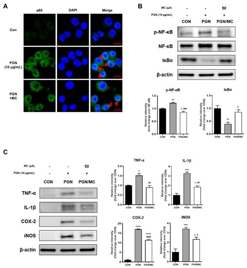 2.2. MC Could Decrease Activity of NF-κB and Related Protein Expression