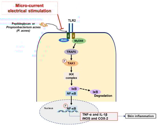 Lee, H.; Hwang, D.; Lee, M.; Lee, J.; Cho, S.; Kim, T.-J.; Kim, H.S. Micro-Current Stimulation Suppresses Inflammatory Responses in Peptidoglycan-Treated Raw 264.7 Macrophages and Propionibacterium acnes-Induced Skin Inflammation via TLR2/NF-κB Signaling Pathway. Int. J. Mol. Sci. 2022, 23, 2508. https://doi.org/10.3390/ijms23052508