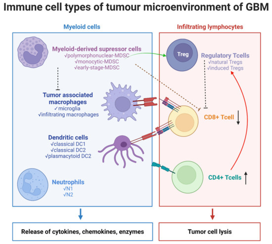 - myeloid cells: tumor-associated macrophages (TAMs)—resident microglia and bone marrow-derived macrophages (BMDMs), dendritic cells (DCs), neutrophils/tumor-associated neutrophils (TANs), myeloid-derived suppressor cells (MDSCs);
