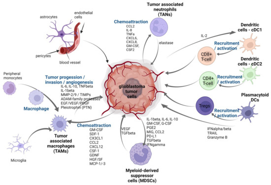 - secretion of several immunosuppressive factors, like cytokine, chemokines, growth factors (IL-6, IL-10, IL-1, TGF-β, prostaglandin E2, bFGF) by tumor cells, microglia, and tumor-associated macrophages (TAMs) [13]