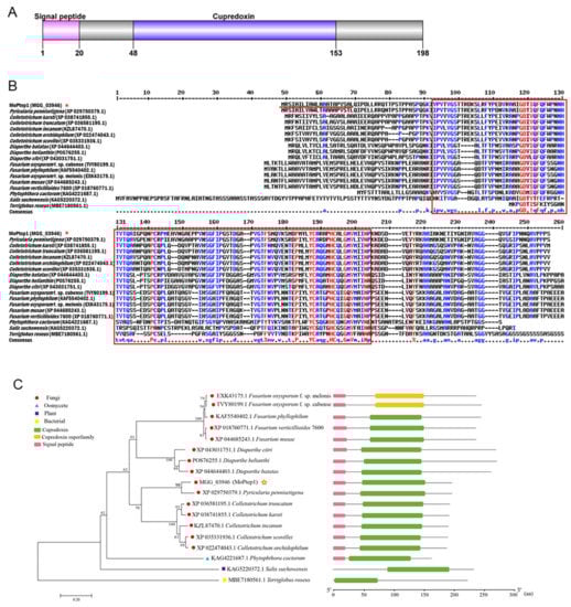 Sequence alignment and phylogenetic analysis of MoPtep1. (A) Structural analysis of MoPtep1. (B) Sequence alignment of MoPtep1 and its homologs. Potential signal peptides (red-underlined) were predicted by Signal-5.0. Residue numbers are denoted above the sequences. Cupredoxin domain is indicated by the red rectangle. (C) Phylogenetic tree of MoPtep1 and homologous amino acid sequences from different species. The phylogenetic tree was constructed using the neighbor-joining method. * represents the MoPtep1, The pink box represents the signal peptide, and the green and yellow boxes represent the cupredoxin domain.