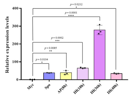 Expression pattern of MoPtep1 in different stages. Samples from vegetative (mycelium and spore) and invasive stages (8, 18, 36, 48 hpi) of barley epidermis were performed by qRT-PCR. Myc: mycelium; Spo: spore; AP: appressoria; IH: invasive hyphae. The bar represents the standard error of the three technical duplications. Significance analysis was analyzed by Student’s t-test, and * indicates p < 0.05, ** indicates p < 0.01, *** indicates p < 0.001, and **** indicates p < 0.0001.