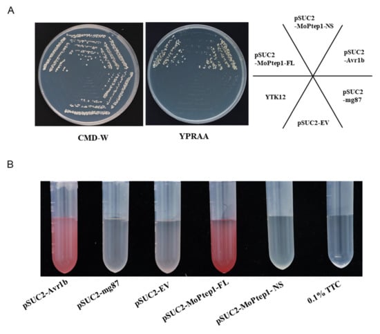 The signal peptide of MoPtep1 was predicted using SignalP-5.0 []. To confirm the secretory function of the supposed N-terminal signal peptide of MoPtep1, the yeast secretion system was used to validate MoPtep1 signal peptides []. Briefly, the full length of the MoPtep1 and the truncated sequence that the predicted signal peptide of MoPtep1 had been deleted were amplified using the primer (Supplemental Table S1), then these two fragments were fused into the pSUC2 vector and named pSUC2-MoPtep1-FL and pSUC2-MoPtep1-NS, respectively. Then, constructs were transformed in the yeast strain YTK12. The recombinant strains were plated on CMD-W medium (0.67% yeast nitrogen base without amino acids, 0.074% -Trp DO supplement, 2% sucrose, 0.1% glucose, 1.5% agar) and YPRAA medium (1% yeast extract, 2% tryptone, 2% raffinose, and 1.5% agar with 2 μg/mL antimycin A) to detect invertase secretion. The pSUC2-Avr1b was used as the positive control, and the pSUC2-mg87 and the pSUC2-empty vector were used as the negative control. Furthermore, the secretion characterization of MoPtep1 was confirmed by the reduction of 2,3,5-triphenyltetrazolium chloride (TTC, T8170, Solarbio) to detect the insoluble red triphenylformazan, as described by Oh et al. []. Briefly, 5 mL of CMD-W liquid medium was inoculated with the above yeast strains that contained the specific constructs and incubated for 16 h at 30 °C. The cells were collected and resuspended with the colorless 0.1% TTC, and then the cells were transferred to a new centrifuge tube and incubated at 37 °C to observe the color change and detect the signal peptide secretion function.