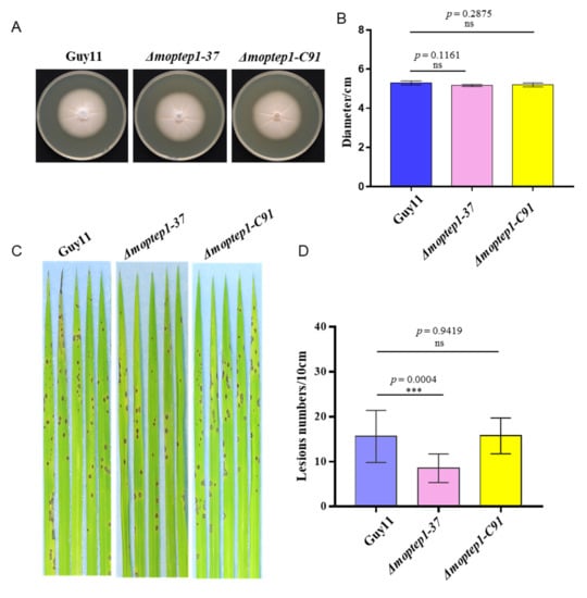 2.4. MoPtep1 Is Important for Pathogenicity, but Not Growth