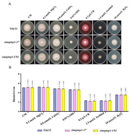 Stress analysis of Δmoptep1 mutant. (A) MoPtep1 growth under multiple stresses. Guy11, Δmoptep1-37, and Δmoptep1-C91 were cultured on CM medium amended without or with stress agent (metal cations: MgCl2, CuSO4; cell wall integrity stressors: Congo red (CR) and SDS; osmotic stress: sorbitol; oxidative stress: H2O2). (B) Statistical analysis of the colony diameters of each strain after being cultured at 25 °C for 10 days. This experiment was repeated at least three times.