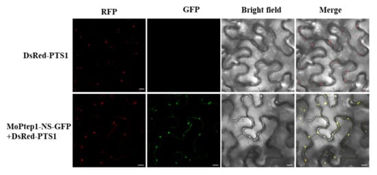 Fungal pathogens inhibit plant host immunity response via the secretion of numerous effectors. The effectors are secreted into host plant cells, different organelles are targeted, and finally, they disrupt plant resistance signaling to decrease resistance. To analyze the subcellular localization of MoPtep1 in plant cells, the transient expression system of N. benthmena was used to verify the localization of MoPtep1. The results demonstrated that MoPtep1-NS-GFP fluorescence fusion protein showed a bright spot signal in the N. benthname leaves’ cells. Further analysis showed that the fluorescence signal of MoPtep1-NS-GFP fusion protein was co-localized in peroxisomes with peroxisome marker protein DsRed-PTS1 (Figure 6). These results indicated that MoPtep1 effector protein was secreted into plant cells and may play a biological function in peroxisomes to regulate the immune response in plant cells.