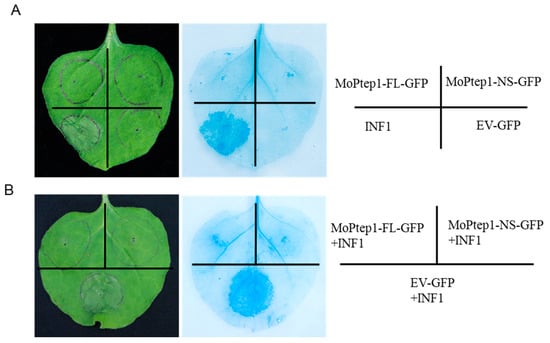 Fungal effectors were secreted into host cells to inhibit or induce host cell death, increasing the pathogen virulence or suppression of host resistance []. To identify whether MoPtep1 affects cell death in nonhost plant N. benthamiana, transient expression analysis was performed through an agrobacterium-mediated method. INF1 protein from oomycete was used as the positive control. The typical cell death symptom was observed in N. benthamiana after INF1 protein infiltration, while no cell death was observed when infected with A. tumefaciens EHA105 cells expressing MoPtep1-FL-GFP or MoPtep1-NS-GFP (Figure 7A). These results suggested that MoPtep1 does not induce cell death in nonhost plant N. benthamiana leaves. On the contrary, the co-expression of MoPtep1-FL-GFP or MoPtep1-NS-GFP and INF1 in N. benthamiana resulted in the inhibition of cell death (Figure 7B). Additionally, after trypan blue staining, the infiltrated area carrying INF1 exhibited dark blue coloring, but the areas with co-filtration treatments of MoPtep1-FL-GFP or MoPtep1-NS-GFP and INF1 did not show dark blue coloring (Figure 7A,B). These results demonstrated that MoPtep1 might play important role in regulating programmed cell death in plant cells.