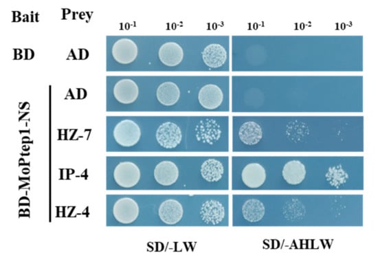 MoPtep1-NS was cloned into the vector pGBKT7 to generate BD-MoPtep1-NS. MoPtep1-NS acted as bait for prey rice proteins through a yeast two-hybrid (Y2H) system (Clontech Laboratories, Mountain View, CA, USA) derived from the yeast cDNA library. The putative MoPtep1-interacting protein genes were identified by sequencing. OsHZ-7, OsIP-4, and OsHZ-4 were amplified by PCR using rice cDNA and then cloned into the prey vector pGADT7. Various combinations of the bait and prey constructs were cotransformed into Y2H Golden competent cells using a PEG/LiAc-based method. The selection of transformants were cultured on SD medium lacking Trp and Leu (SD-LW). Transformants were subsequently transferred to a medium lacking Trp, Leu, His, and Ade (SD-AHLW) for incubation at 28 °C for 3 days.