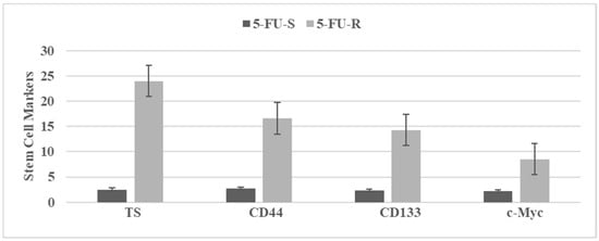 The status of stem cell markers in 5-fluoro-uracil resistant (5-FU-R) Mlh1/1638N COL phenotype. Figure 3. TS: tumor spheroid number determined at day 14 after seeding 100 cells. Data expressed as Mean ± SD, n = 3 per treatment group. CD44, CD133 c-Myc. RFU determined at day four after seeding 1.0 × 105 cells. Data expressed as Mean ± SD, n = 3 per treatment group. Data analyzed by paired Student’s t-test. 5-FU-S, 5-fluoro-uracil sensitive; 5-FU-R, 5-fluoro-uracil resistant; CD, cluster of differentiation; c-Myc, cellular Myc; RFU, relative fluorescent unit. Data summarized from [].