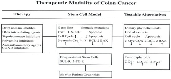 The use of conventional and targeted therapy for colon cancer is limited by systemic toxicity, acquired tumor resistance and the emergence of drug-resistant stem cells. Dietary natural products and herbal formulations, due to their lack of systemic toxicity and documented human consumption, may represent testable alternatives for therapy resistant colon cancer. Patients presenting with advanced stage therapy-resistant breast and colon cancer frequently seek to follow complementary and alternative medicine. Herbal formulations from folk medicines used by the indigenous native population in the regions of Latin America, India and China are common [,]. However, the evidence for their efficacy is predominantly anecdotal, and lacks relevant peer reviewed clinical evidence. In contrast, herbal formulations common in traditional Chinese medicine are most frequently used in Europe and other regions. The cellular models are developed from genetically predisposed colonic epithelium [,,], stem cell models are developed from drug-resistant colonic epithelial cells [,,], and tumor spheroid models are developed either from patient derived cancer stem cell-enriched spheroids [,] or from sporadic cancer derived cell lines [,]. Experimental modulations are quantified by specific and sensitive end point markers, such as cell membrane proteins and nuclear transcription factors. These aspects validate novel experimental approaches to identify new stem cell targeting pharmacological agents and potential natural products as lead compounds. These agents may represent efficacious alternatives for stem cell targeted therapy of colon cancer. The present experimental approaches may identify clinically translatable mechanistic leads applicable to patients.