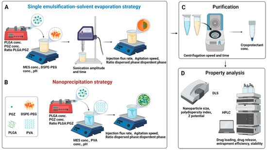 - Hernández-Giottonini, K.Y.; Rodríguez-Córdova, R.J.; Gutiérrez-Valenzuela, C.A.; Peñuñuri-Miranda, O.; Zavala-Rivera, P.; Guerrero-Germán, P.; Lucero-Acuña, A. PLGA Nanoparticle Preparations by Emulsification and Nanoprecipitation Techniques: Effects of Formulation Parameters. RSC Adv. 2020, 10, 4218–4231. [Google Scholar] [CrossRef] [Green Version]