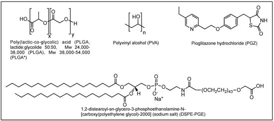 - Silva-Abreu, M.; Calpena, A.C.; Espina, M.; Silva, A.M.; Gimeno, A.; Egea, M.A.; García, M.L. Optimization, Biopharmaceutical Profile and Therapeutic Efficacy of Pioglitazone-Loaded PLGA-PEG Nanospheres as a Novel Strategy for Ocular Inflammatory Disorders. Pharm Res. 2018, 35, 11. [Google Scholar] [CrossRef] [Green Version]