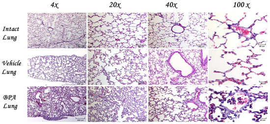 Histological examination of the lungs of female mice exposed to BPA without tumors. Representative images of the lungs in female mice exposed to BPA without tumor induction at different magnifications (4×, 20×, 40×, and 100×).