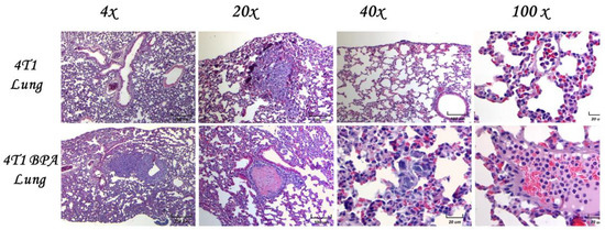 Then, we decided to explore the histological damage of the lungs due to exposure to BPA in the female mice without tumors. Figure 4 shows the comparison of the microarchitecture of the lungs among experimental groups of the control, vehicle, and BPA-treated animals at different magnifications (4×, 20×, 10×, and 40×). We found no signs of inflammation, nor necrotic foci, and no new vascularization in any of the representative images shown. Of note, BPA treatment induced a slight inflammatory infiltrate into the lungs, as was judged at the 100× magnification in the center of the image. Moreover, the animals had no signs of disease (fur appearance, motility, mobility, food and water intake, and other behaviors were similar among non-tumor groups).