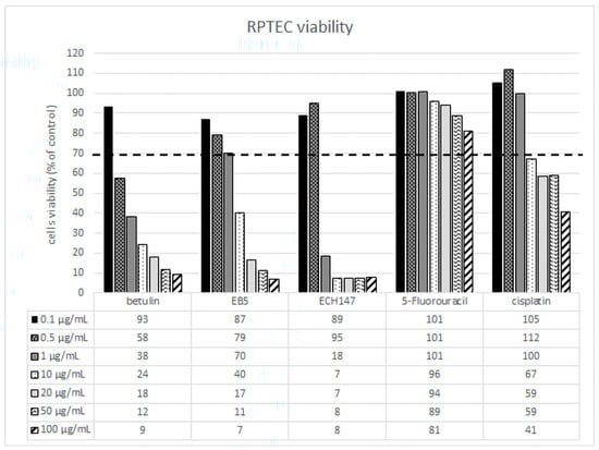 Normal human RPTECs (CC-2553, Lonza, Basel, Switzerland) were routinely maintained at 37 °C in a 5% CO2 incubator (Direct Heat CO2; Thermo Scientific, Waltham, MA, USA) with the use of a REGM Bullet Kit (renal epithelial basal medium (REBM), supplements, and growth factors (SingleQuots) CC-3190, Lonza). The MTT (3-[4,5-dimethylthiazol-2-yl]-2,5-diphenyltetrazolium bromide) assay (Sigma–Aldrich, St Louis, MO, USA) was used to determine the influence of betulin, EB5, ECH147, cisplatin, and 5-fluorouracil on RPTECs viability. Cells were treated with tested compounds for 24 h at concentrations: 0.1, 0.5, 1, 10, 20, 50, and 100 μg/mL. Controls were left untreated. MTT (0.25 mg/mL) was added to the medium for 3 h (37 °C). After washing with PBS, cells were lysed in 100 μL of dimethyl sulfoxide (Sigma-Aldrich). Absorbance was measured at the wavelength of 540 nm with the use of microplate reader Wallac 1420 VICTOR (PerkinElmer, Waltham, MA, USA). Based on the MTT test results, two concentrations of compounds were determined for further studies: 0.1 and 0.5 μg/mL. These concentrations influenced the viability of the cells, but at the same time allowed for further research. RPTEC cells were treated with the tested compound at concentrations 0.1 and 0.5 μg/mL for 24 h. Untreated cells served as negative controls. Each variant of the experiment was performed in three biological replications.