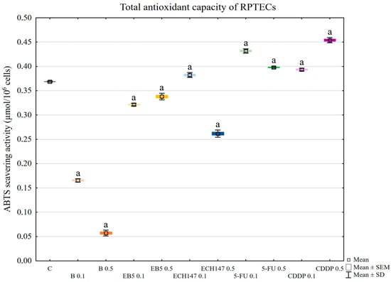 In the next stage, the total antioxidant capacity of the RPTECs was assessed. Betulin strongly lowered the antioxidant capacity of kidney cells. EB5 also lowered the antioxidant potential, but not to the same extent as betulin, while ECH147 lowered the potential only at the higher concentration used (0.5 µg/mL). Interestingly, cisplatin and 5-fluorouracil increased the antioxidant potential of the RPTECs. This result was particularly surprising in the case of cisplatin, the mechanism of action of which is based, inter alia, on the induction of oxidative stress [
