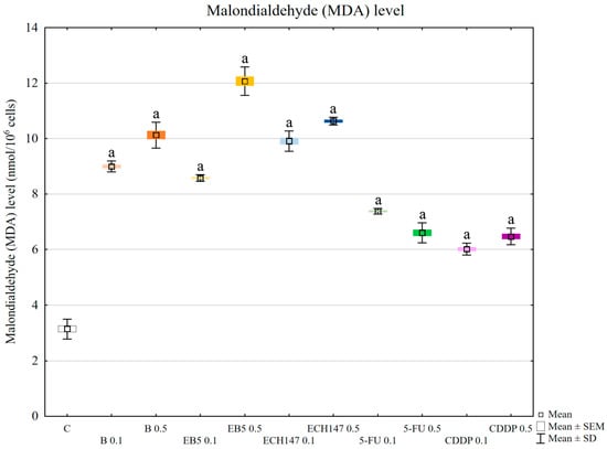 To evaluate the effect of oxidative stress induction on cellular molecules, malondialdehyde (MDA) levels were assessed. All tested compounds increased the level of MDA in RPTEC cells; however, betulin and its derivatives had a greater effect than the reference drugs. This result confirmed that oxidative stress caused by betulin and its derivatives during 24 h of incubation is stronger than that caused by cisplatin and 5-FU. Malondialdehyde is a product of lipid peroxidation, and its level is used as a marker of kidney damage [