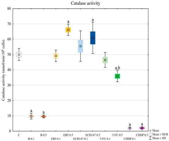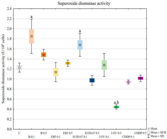33]. Moreover, this enzyme prevents lipid peroxidation. Therefore, the reduction in catalase activity by betulin, comparable to that observed for cisplatin, supports the nephrotoxic potential of betulin. This mechanism probably involves the functional impairment of mitochondria. Importantly, at higher concentrations, betulin derivatives EB5 and ECH147 increased the activity of catalase, which gives hope that these compounds will not cause serious consequences for kidney cells in vivo. SOD activity was increased in cells treated with betulin and ECH147 at lower concentrations, compared to the control and cells treated with other compounds. The inhibition of SOD activity results in an increased generation of ROS in kidney cells [