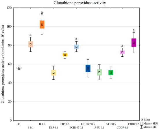 Glutathione peroxidase (GPx) activity was determined using a Cayman Chemical’s Glutathione Peroxidase Assay Kit (Cayman Chemical), according to the manufacturer’s protocol. The GPx activity was indirectly measured using a coupled reaction with glutathione reductase (GR (glutathione reductase). GPx catalyzes the reduction reaction of cumene hydroperoxide and, as a result, an oxidized form of glutathione is formed, which was then reduced in the presence of GR and NADPH oxidation to NADP+ (accompanied by a decrease in absorbance). The decrease in absorbance is directly proportional to the GPx activity in the sample. Activity was evaluated based on the spectrophotometric measurement at 340 nm.