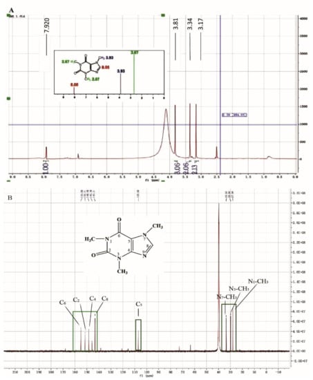 The 98.78% pure of FBT was obtained with a series of specific separation and extraction steps, which are shown in the supplemental materials (Figures S1 and S2). The structural formula of FBT is shown in Figure 1. In order to characterize the group information of FBT, nuclear magnetic resonance analysis (1H-NMR and 13C-NMR) was carried out on FBT. The absorption peak frequency on the NMR spectrum, namely chemical shift δ, is one of the important parameters of the NMR spectrum. Figure 1A shows the 1H-NMR analysis of Fu Brick tea pigment, Δ δ3.17 (3H, s, N1-CH3), Δ δ3.34 (3H, s, N3-CH3), Δ δ3.81 (3H, s, N7-CH3), Δ δ7.92 (1H, s, C8-H) and the 1H-NMR peaks Δ 2.67 (3H, s, N1-CH3), Δ 2.67 (3H, s, N3-CH3), δ3.93 (3H, S, N7-CH3), δ8.05 (1H, S, C8-H) belong to similar positions. In the analysis results, a relatively wide peak at Δ 4.2 position is water peak, which may be due to the deviation of peak shifts of other groups. Figure 1B shows 13C-NMR analysis and judgment. The positions of the absorption peaks of Δ 27.94 (n1-CH3), Δ 29.81 (n3-CH3), Δ 33.57 (n7-CH3), Δ 107.35 (C5), Δ 143.27 (C8), Δ 148.31 (C4), Δ 151.55 (C2), Δ 154.79 (C6) are basically consistent with the positions of the carbon spectrum peaks of theanine in the document. From this, it is judged that this compound is tea alkali in Fu Brick tea, and its chemical structure is shown in Figure 1B. In this paper, it is named Fu Brick Theophylline, abbreviated FBT.