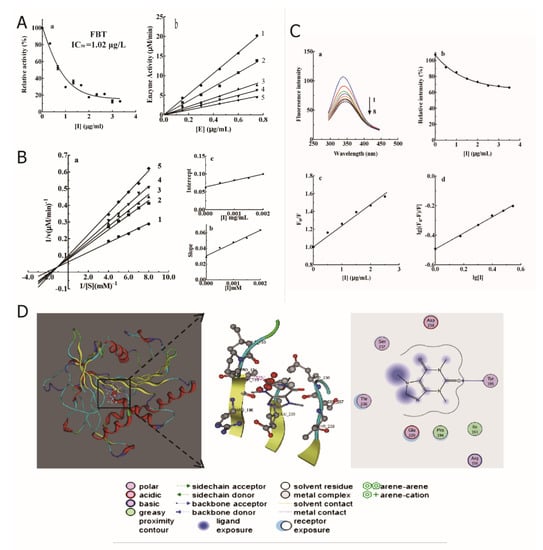 As shown in Figure 2C-a, with the continuous addition of FBT, the fluorescence emission peak of lipase gradually decreased but did not affect the peak shape and peak position of the enzyme fluorescence emission spectrum. This shows that FBT and lipase form an enzyme-FBT complex, which prevents the enzyme from binding to the substrate and achieves the effect of inhibiting the catalytic activity of the enzyme. Figure 2C-b is the peak height value corresponding to Figure 2C-a. The peak of the lipase fluorescence spectrum gradually decreases with the increase in the amount of FBT.