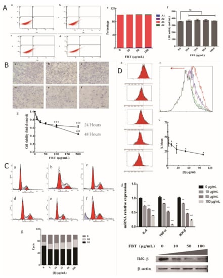 The DCFH-DA was used as a fluorescent probe of the active oxygen detection kit to combine the active oxygen in the cell with the fluorescent DCFH to generate fluorescent DCF. The level of ROS was measured on a flow cytometer based on the amount of DCF fluorescence. Figure 3D-a shows the ROS peak of adipose cells 24 h after FBT treatment. With the increase of FBT concentration, the mean value of ROS X gradually decreases compared with the control group (3D-c), and the peak value gradually shifts to the left (3D-b). These results suggest that FBT can reduce the ROS level of 3T3-L1 preadipocytes (F (5, 12) = 15.48, p < 0.0001). Furthermore, the mRNA expression levels of ROS-related genes, including the key kinase interleukin 6 (IL-6) (F (3, 4) = 126.5, p = 0.0002), tumor necrosis factor (TNF-α) (F (3, 4) = 457.5, p < 0.0001), and inhibitor kappa B kinase β (IκKβ) (F (3, 4) = 360.6, p < 0.0001), were downregulated with increasing concentrations of FBT, as shown in Figure 3D-d. TNF-α and IL-6 have a variety of effects on the physiological functions of adipocytes, and IKK-β is a key hub for inflammatory signals to interfere with insulin signals [], which can mediate chronic inflammation induced by obesity. Their decrease indicates that FBT has a certain restriction on the inflammatory response.