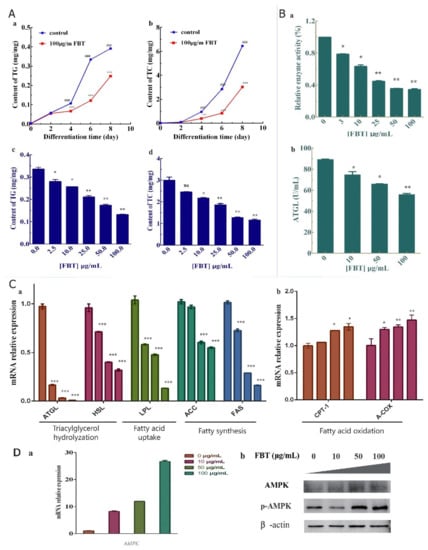 (A) The effect of FBT on the changes in TG and TC content during the differentiation of 3T3-L1 preadipocytes. (A-(a,b)) Changes in TG and TC contents within eight days of the cell differentiation process under the 100 μg/mL FBT treatment; (A-(c,d)) The contents of TG and TC under different concentrations of FBT on the sixth day of differentiation. * p < 0.05, ** p < 0.01, and *** p < 0.0001 versus the control group; ### p < 0.0001 versus different times at the same concentration. (B) Effects of FBT on the related metabolism of 3T3-L1 cells. (B-a) 4-NPP was used as a substrate to detect lipase activity by UV spectroscopy. (B-b) ATGL activity detection results. (C) Lipid metabolism of 3T3-L1-related gene expression with FBT; (C-a) Gene expression related to triacylglycerol hydrolyzation, fatty acid uptake and fatty synthesis under FBT (0, 10, 50 and 100 μg/mL) treatment; (C-b) Effects of FBT on the mRNA levels of genes related to fatty acid oxidation. (D-a), AMPK gene expression with RNA; (D-b), AMPK and phosphorylated AMPK protein expression with Western Blot.