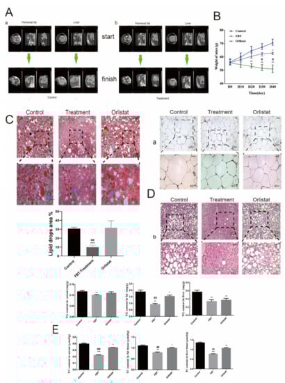 (A) Comparison of PET-CT scan results of mice before and after gavage. (A-a) PET-CT scan of perirenal fat and liver in the control group; (A-b) PET-CT scan of perirenal fat and liver in the FBT treatment group. (B) Weight changes in different groups over 40 days. (C) Frozen sections of liver were stained with Oil Red O, and the lipid droplet area was quantified using ImageJ. (D) HE staining of paraffin sections of mouse white adipose tissue and liver tissue (n = 6). (E) The contents of TG and TC in mouse liver, white fat and serum. * p < 0.05, ** p < 0.01, and *** p < 0.0001 versus the control group; # p < 0.05, ## p < 0.01, and ### p < 0.0001 versus the orlistat group.