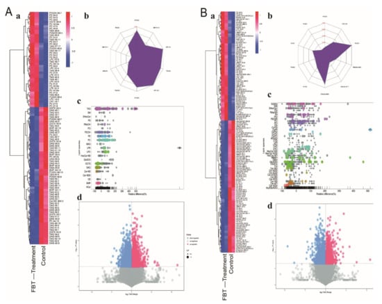 The ionization source of the LC-QTOFMS platform is electrospray ionization, and there are two ionization modes: (A) positive ion mode (POS), (B) negative ion mode (NEG). The combination of the two modes in the detection of the metabolome can increase the metabolite coverage rate. a: Heatmap of hierarchical clustering analysis for the group (FBT treatment vs. the control). b: Radar chart analysis for group. (FBT treatment vs. te control). c: Lipid species of bubble plot for the group (FBT treatment vs. the control). Each point in the lipid bubble diagram represents a metabolite. The size of the point represents the p-value of the Student’s t-test (taking the negative number of the logarithm base 10), and a larger point represents a smaller p-value. Grey dots represent nonsignificant differences with a p-value not less than 0.05, while colored dots represent significant differences with a p-value less than 0.05 (different colors are marked according to lipid classification). d: Volcano plot for the group (FBT treatment vs. the control).