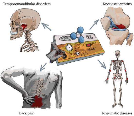 Several other musculoskeletal diseases might take advantage of the O2O3 therapy that is commonly used in the PRM clinical practice. However, only a few papers have investigated the effects of O2O3 therapy on other musculoskeletal disorders leading to disability (i.e., cervical pain, tendinopathies, and fibromyalgia). Moreover, it should be considered that O2O3 therapy is commonly used in the clinical practice as anti-inflammatory and analgesic therapeutic option for temporomandibular disorders (TMD) and general musculoskeletal and rheumatic diseases (Figure 1).