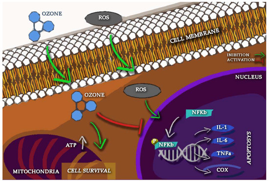 Moreover, it has been demonstrated that low amounts of ozone increased endogenous antioxidant pathways, entangling glutathione (GSH), superoxide dismutase (SOD) and catalase (CAT), and preparing the host to face ROS-mediated physiopathological circumstances. The ozone, through oxidative preconditioning, protects tissues from ROS-related damage, promoting the antioxidant–prooxidant balance and the concomitant preservation of the cell redox state [26,27,28]. Therefore, we could hypothesize that O2O3 mixture could enhance proinflammatory cytokine modulation [29].