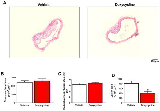 The hypercholesterolemic diet led to the appearance of atherosclerotic lesions in the thoracic aorta of ApoE-⁄-/OVX animals (Figure 1A–D). Doxycycline treatment decreased the area of atherosclerotic lesions in the ApoE-⁄-/OVX group relative to the vehicle group (p > 0.05, Figure 1A,D). No hypertrophy of the tunica media was observed as evidenced by the quantification of the cross-sectional area and the ratio of tunica media and lumen diameter between the two experimental groups (p > 0.05, Figure 1A–C).