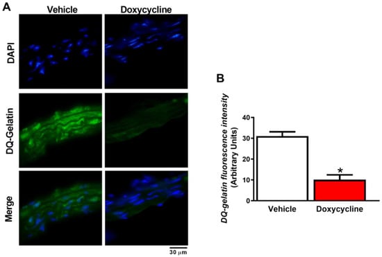 Doxycycline decreases MMP activity in the aorta of ApoE-⁄-/OVX mice. (A) Representative fluorescence microscope photomicrographs of mice aortic sections of ApoE-⁄-/OVX vehicle and doxycycline, incubated with DAPI and DQ-gelatin. DAPI’s blue fluorescence indicates nuclei, and green fluorescence represents MMP activity (DQ-gelatin), followed by the merge of the images showing the cell and vascular gelatinolytic MMP activity. (B) The gelatinolytic activity was quantified by measuring the intensity of green fluorescence. Values are expressed as mean ± SEM. * p < 0.05 vs. vehicle, t-Student test (n = 6 group). Scale bar: 30 µm.