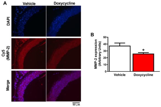 Doxycycline decreases MMP-2 expression in the aorta of ApoE-⁄-/OVX mice. (A) Representative fluorescence microscope photomicrographs of ApoE-⁄-/OVX vehicle and doxycycline mice aortic sections, incubated with DAPI and anti-MMP-2 antibody (Cy5 used as a secondary antibody). DAPI blue fluorescence indicates nuclei, and red fluorescence indicates MMP-2 labeling in vascular tissue, followed by the merge of the images showing the cell and MMP-2 staining. (B) Quantification of Cy5 fluorescence intensity (indicating MMP-2 expression). Values are expressed as mean ± SEM. * p < 0.05 vs. vehicle, t-Student test (n = 6 group). Scale bar: 50 µm.