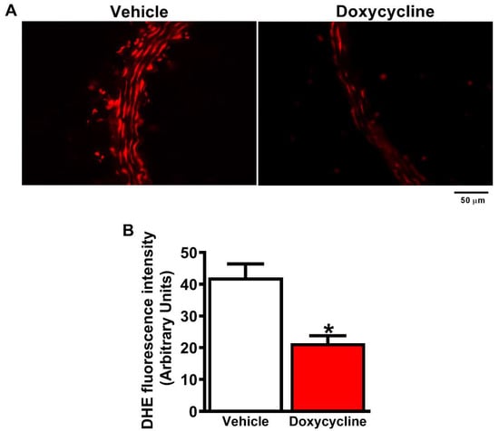 Doxycycline decreases ROS levels in the aorta of ApoE-⁄-/OVX mice. (A) Representative fluorescence microscope photomicrographs of ApoE-⁄-/OVX vehicle and doxycycline mice aortic sections, incubated with the DHE probe. Red fluorescence reflects ROS production, decreased in the ApoE-⁄-/OVX doxycycline group. (B) Quantification of DHE fluorescence intensity that reflects ROS levels. Values are expressed as mean ± SEM. * p < 0.05 vs. vehicle, t-Student test (n = 6 group). Scale bar: 50 µm.