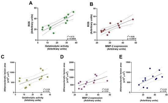 Doxycycline has an antiatherogenic effect correlated with decreased gelatinolytic activity, MMP-2 expression, and ROS levels in aortas of ApoE-⁄-/OVX mice. (A) Scatter plot showing the correlation between increased gelatinolytic activity and ROS levels. (B) Scatter plot showing the positive correlation between increased MMP-2 expression and ROS levels. (C) Scatter plot showing the positive correlation between the increase in atherosclerotic lesions associated with the rise in gelatinolytic activity. (D) Scatter plot showing the positive correlation between the increase in atherosclerotic lesions related to the increase in MMP-2 expression. (E) A scatter plot shows the positive correlation between an increase in atherosclerotic lesions associated with increased ROS levels. Correlation analyses were performed using the data reported in Figure 1, Figure 2, Figure 3 and Figure 4. Pearson’s correlation test was performed. The solid line represents the linear regression. Regression coefficient (r) and statistical significance (p) are reported for each test, p values < 0.05 were considered significant.
