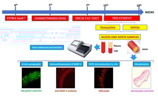The workflow of the experimental design of the study. This study used four-week-old female C57Bl6 Knockout ApoE-⁄- mice. In the 5th week of life, the animals underwent ovariectomy to induce experimental menopause. For induction of atherosclerosis, the hypercholesterolemic diet was instituted from the 7th week of life until the end of the experimental protocol. Treatments with vehicle (water) and doxycycline 30 mg/kg were administered by gavage once a day from the 15th week to the 18th week of life (28 days). After treatment, the animals were euthanized, and thoracic aorta and blood were collected. Aorta was used for morphometric analysis (using hematoxylin and eosin sections), gelatinolytic activity (using DQ-gelatin substrate), MMP-2 expression (using anti-MMP-2 antibody), and ROS (using DHE probe). Plasma samples were obtained for measurement of total cholesterol and fractions.