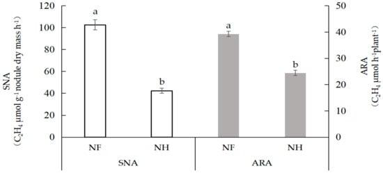 The nitrogenase activity of dual-root soybean nodules. SNA is the specific nitrogenase activity, and ARA is the acetylene reduction activity. Different lowercase letters indicate a significant difference between the treatments at the 5% level.