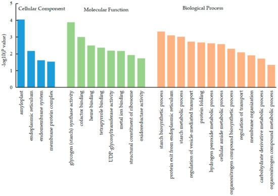 The DEPs of soybean nodules tissue in the CC group were mostly enriched in the amyloplast, endoplasmic reticulum, endomembrane system, membrane protein complex, etc. The DEPs in the MF group were mostly enriched in glycogen (starch) synthase activity, cofactor binding, heme binding, tetrapyrrole binding, UDP-glycosyl transferase activity, metal ion binding, oxidoreductase activity, structural constituent of ribosome, etc. Those in the BP group were mostly enriched in starch biosynthetic process, protein exit from endoplasmic reticulum, starch metabolic process, regulation of vesicle-mediated transport, protein folding, hydrogen peroxide metabolic process, cellular amide metabolic process, organonitrogen compound biosynthetic process, regulation of transport, membrane organization, carbohydrate derivative metabolic process, organonitrogen compound metabolic process, etc. These findings indicated that nitrogen treatment can regulate carbon metabolism and nitrogen metabolism in soybean nodule tissue, thereby affecting the nitrogen fixation ability of nodules (Figure 2).