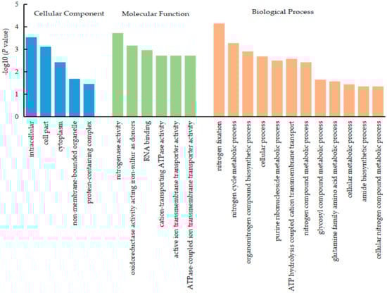 The DEPs of soybean rhizobia in the CC group were mostly enriched in the cytoplasm, nonmembrane-bound organelles, protein-containing complexes, etc. The DEPs in the MF group were mostly enriched in nitrogenase activity, oxidoreductase activity, acting on iron-sulfur proteins as donors, RNA binding, cation-transporting ATPase activity, active ion transmembrane transporter activity, ATPase coupled ion transmembrane transporter activity, etc. Those in the BP group were mostly enriched in nitrogen fixation, nitrogen cycle metabolic process, organonitrogen compound biosynthetic process, cellular process, ATP hydrolysis coupled cation transmembrane, purine ribonucleoside metabolic process, nitrogen compound metabolic process, glycosyl compound metabolic process, glutamine family amino acid metabolic process, amide biosynthetic process, cellular nitrogen compound metabolic process, etc. The results were the same as those for nodule tissue, and most of the differential proteins in rhizobia were enriched in the process of nitrogen and carbon metabolism (Figure 3).