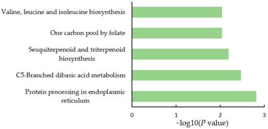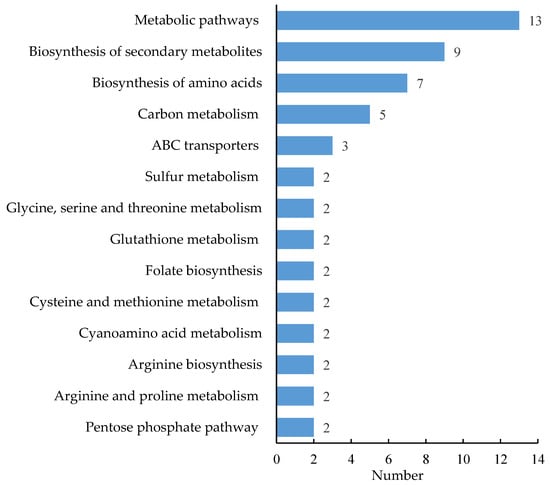 Figure 6 presents the metabolic pathways enriched with DEMs. The DEMs were enriched mostly in metabolic pathways, biosynthesis of secondary metabolites, biosynthesis of amino acids, pentose phosphate pathway, carbon metabolism, ABC transporters, sulfur metabolism, glycine, serine and threonine metabolism, glutathione metabolism, folate biosynthesis, cyanoamino acid metabolism, cysteine and methionine metabolism, arginine biosynthesis, and arginine and proline metabolism.