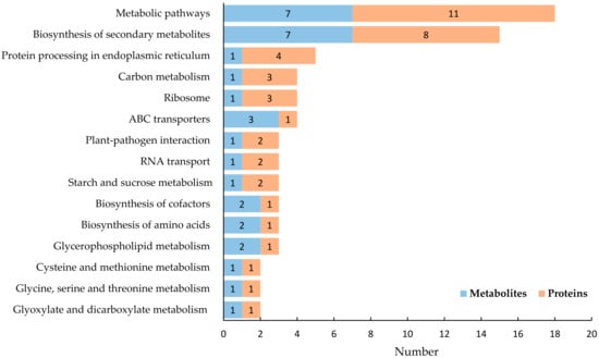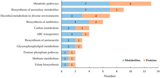 The KEGG pathways involving both the DEPs and DEMs in soybean rhizobia. Orange indicates the number of DEPs involved, and blue indicates the number of DEMs.
