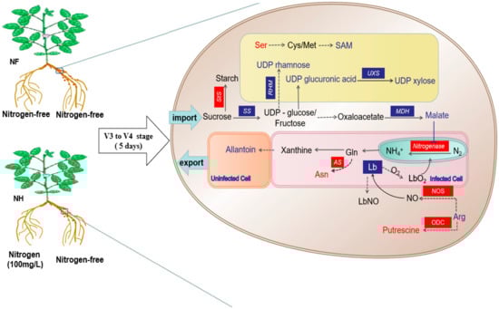 A comparison between soybeans treated with and without nitrogen showed that nitrogen regulated the metabolic pathways of starch and sucrose metabolism, organic acid metabolism, sulfur metabolism, nitrogen metabolism, amino acid metabolism, etc. Additionally, exogenous nitrogen promoted the synthesis of signaling molecules, including putrescine, nitric oxide, and asparagine, in root nodules and inhibited the transformation of sucrose to malic acid; consequently, the rhizobia lacked energy for nitrogen fixation. In addition, exogenous nitrogen reduced cell wall synthesis in the root nodules, thus inhibiting root nodule growth and nitrogen fixation.