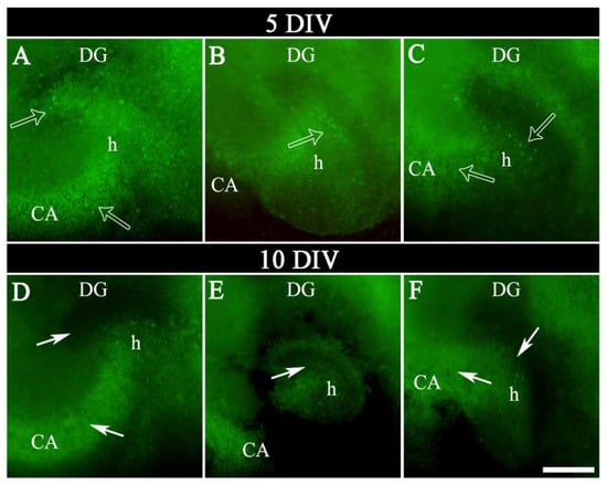 Photomicrographs of hippocampal slices from Chips 1, 2, and 3 illustrating in greater detail the different patterns of OGB marker in CA, DG, and h, at 5 DIV (A–C) and 10 DIV (D–F). Note the evident changes in the OGB labeling distribution between 5 and 10 DIV. A dense dot-shaped labeling, corresponding living cells (open arrows) was scattered through whole hippocampal formation, at 5 DIV (medium phase) (A–C). By contrast, at 10 DIV there was a sharp decrease labeling with partial or total lack of OGB labeled cells (white solid arrows) in some zones of CA, DG, and h (late phase) (D–F). CA, cornu Ammonis subfield; DG, dentate gyrus; DIV, days in vitro; h, hilus. Scale bar shown in F indicates 270 µm in (A–F).