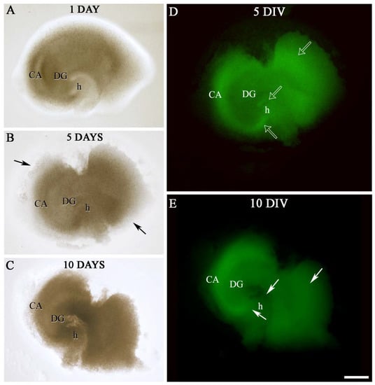 A representative septal section of P7 mice hippocampal formation in OHSC. Low-power photographs from a slice placed onto cell culture insert at 1 (A), 5 (B,D), and 10 DIV (C,E). (A–C) displayed a progressive shrinkage of section thickness (black solid arrows) from 1 DIV (A) to 10 DIV (C) lower than chip slices (B) (see also Figure 3). (D,E) showed the same general pattern of distribution of OGB labeling throughout the hippocampal subregions up to 10 DIV observed in the organ-on-a-chip. Note the changes in the OGB labeling distribution between 5 and 10 DIV. At 5 DIV (medium phase) a dense dot-shaped labeling was observed through whole hippocampal formation (open arrows) (D). By contrast, at 10 DIV there was a sharp decrease labeling with partial or total lack of OGB labeled cells (solid arrows) in some zones of hippocampal formation (late phase) (D–E). CA, cornu Ammonis subfield; DG, dentate gyrus; DIV, days in vitro; h, hilus. Scale bar shown in E indicates 510 µm in (A–C) and 480 µm in (D,E).