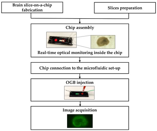 A new reagent injection system was implemented in this brain slice-on-a-chip to overcome the gap between microfluidic and traditional methods, such as roll tube culturing or membrane inserts methods. This methodology allows the local administration into the microfluidic chamber of the chip, interacting instantaneously with the culture avoiding extra microfluidic components to optimize the process. After chip fabrication, it was necessary to test two conditions. On the one hand, if the chip remains watertight, without causing biological contamination and alterations in the internal pressure of the chip after several injections, and on the other hand, if the administered reagent interacts with the sample on the membrane. The fluorescent marker OGB was dispensed through the injection system in every chip to verify those statements.