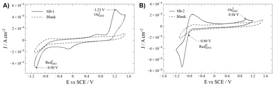 The reagents used for the synthesis were commercially available by Aldrich, and they were used without further purification. FTIR spectra were obtained on a Tracer-100 FT-IR spectrophotometer (Shimadzu, Kyoto, Japan) with a KBr pellet. 1H NMR, HHCOSY, 13C NMR, CHCOSY, and DEPT 45 for SB-1 and/or SB-2 were recorded on a Bruker AVANCE 400 spectrometer (Bruker, Billerica, MA, USA) (400 MHz for 1H and 100 MHz for 13C) at 25 °C and are reported in ppm downfield from TMS. Unless otherwise stated, samples were dissolved in deuterated DMSO containing tetramethyl silane as an internal reference. Melting points were determined on a Stuart Scientific melting point apparatus SMP3 (Stuart, Staffordshire, UK) in open capillary tubes and were uncorrected. Elemental analyses (CHNS) were performed in a Thermo Flash 2000 Series (Thermo Scientific, Waltham, MA, USA), with a thermal conductivity detector (TCD). In addition, ESMS (electrospray mass spectrometry) of SB-1 was performed with a MS 2020 instrument (Shimadzu, Kyoto, Japan). For the electrochemical experiments, a working solution contained 10−3 mol L−1 of the respective compound (SB-1 and SB-2) with 10−1 mol L−1 tetrabutylammonium hexafluorophosphate (TBAPF6, supporting electrolyte) in anhydrous CH3CN. Before each experiment, the working solution was purged with high purity argon, and an argon atmosphere was maintained during the experiment, as previously reported [24,47]. A polycrystalline non-annealed platinum disc (2 mm diameter) was used as the working electrode. A platinum gauze of a large geometrical area, separated from the cell’s main compartment by a fine sintered glass, was used as the counter electrode. All potentials quoted in this paper refer to an Ag/AgCl electrode in tetramethylammonium chloride to match the potential of a saturated calomel electrode (SCE) at room temperature. All electrochemical experiments were performed at room temperature on a CHI900B bipotentiostat (CH instruments, Austin, TX, USA) interfaced to a PC running the CHI 9.12 software (CH instruments, Austin, TX, USA) that allowed experimental control and data acquisition [48,49].