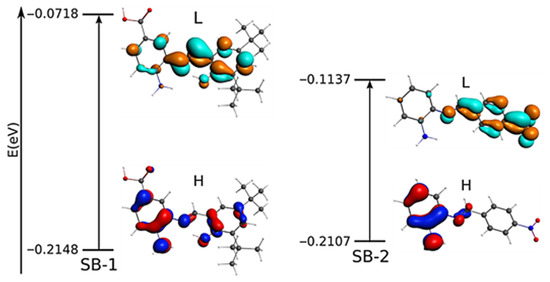 Qualitative molecular orbital diagram for SB-1 and SB-2 with the most important electronic transitions. Occupied orbitals: red and blue; unoccupied orbitals: orange and cyan. L: LUMO; H: HOMO.