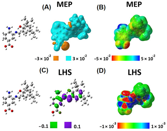These local reactivity descriptors (MEP and LHS) were projected onto an electron density isosurface of 0.001 (or 0.001 a.u.) as previously proposed [38], to produce maps that allow for analyzing of how the values of these descriptors evolve along with the entire molecular structure (Figure 4B,D and Figure 5B,D). For SB-1, Figure 4A shows a predominance of electrons on the hydroxyl groups located at the carboxylic function (amino-benzoic acid ring) and the hydroxyl groups of the phenolic ring. The MEP map in Figure 4B confirms the acidic behavior of the hydrogen of the carboxylic function and the subtle acidic behavior of the hydrogens of the amino group. According to this qualitative information, interactions with a cationic species should occur on the hydroxylic groups’ oxygens. By contrast, a species showing an anionic character should interact with the amino group’s hydrogens and more favorably with the carboxylic function’s hydrogens.